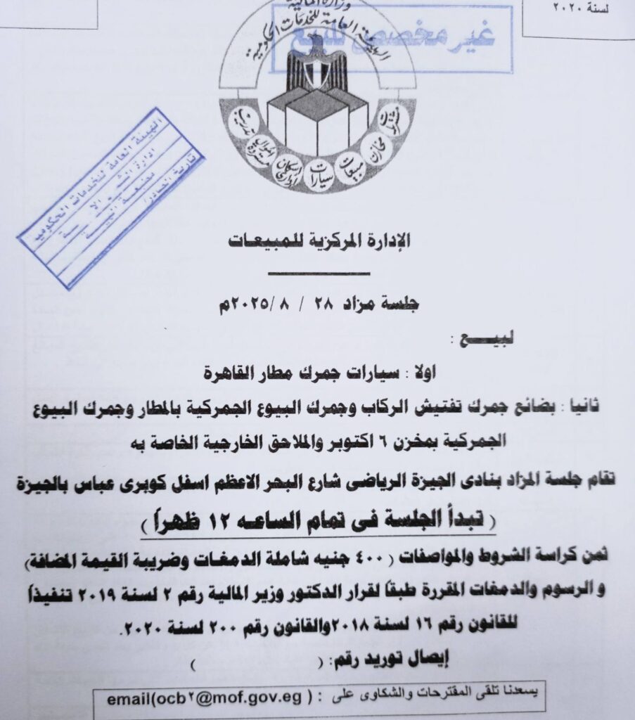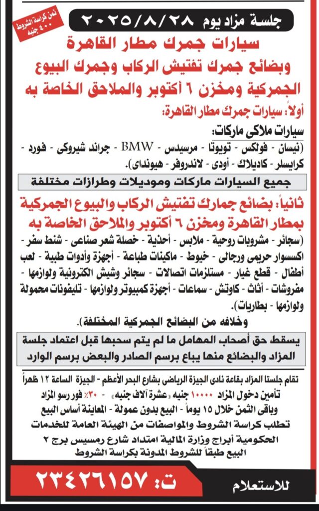 مزاد سيارات جمرك مطار القاهرة الدولي أغسطس 2025