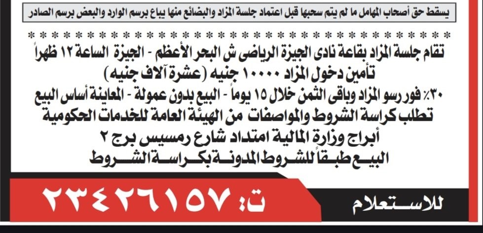 لا تفوت الفرصة، وسارع بشراء كراسة الشروط والاشتراك في المزاد المقرر عقده يوم 3 سبتمبر 2025 بقاعة نادي الجيزة الرياضي. استعد لخوض تجربة شراء فريدة تضمن لك الحصول على أفضل الصفقات الممكنة.