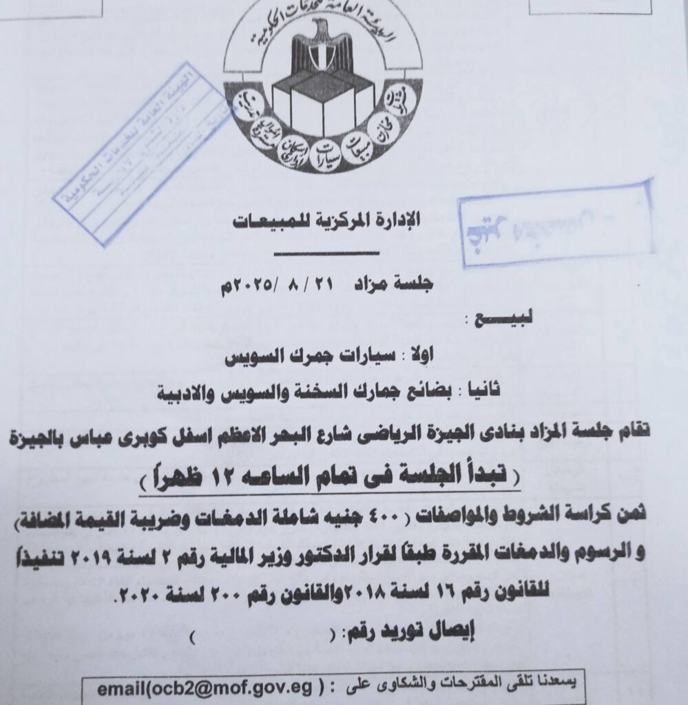 تستعد الهيئة العامة للخدمات الحكومية لتنظيم جلسة مزاد علني لبيع سيارات جمرك السويس يوم الاثنين الموافق 21 أغسطس 2025.