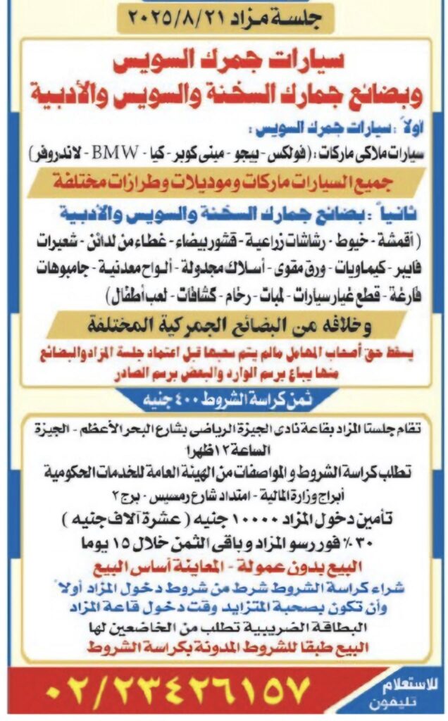 ننشر تفاصيل مزاد سيارات جمرك السويس أغسطس 2025