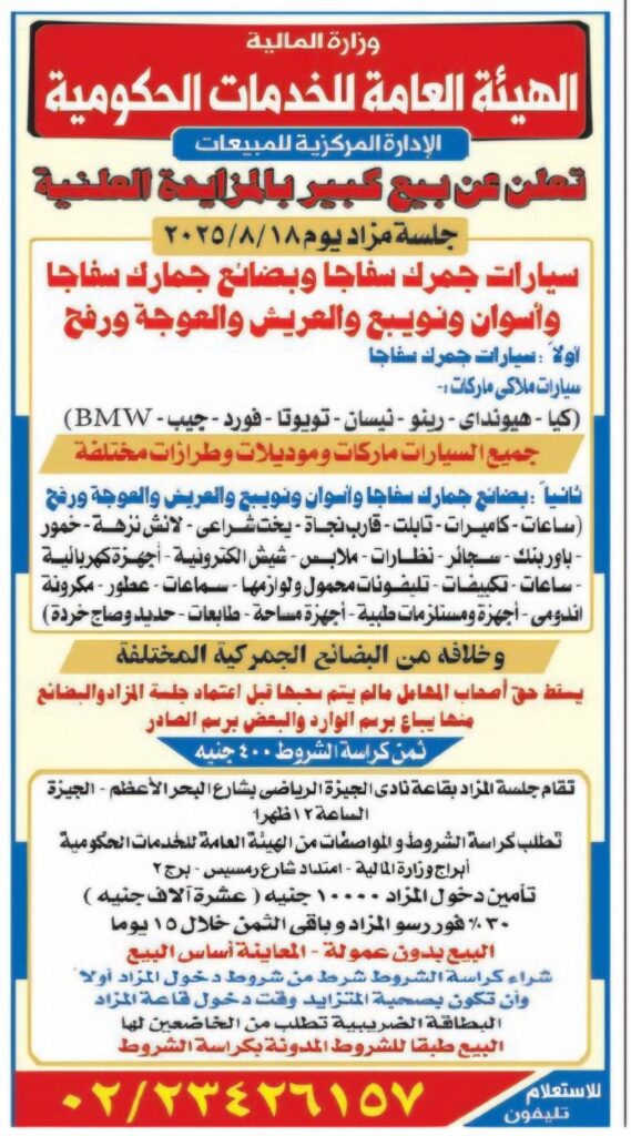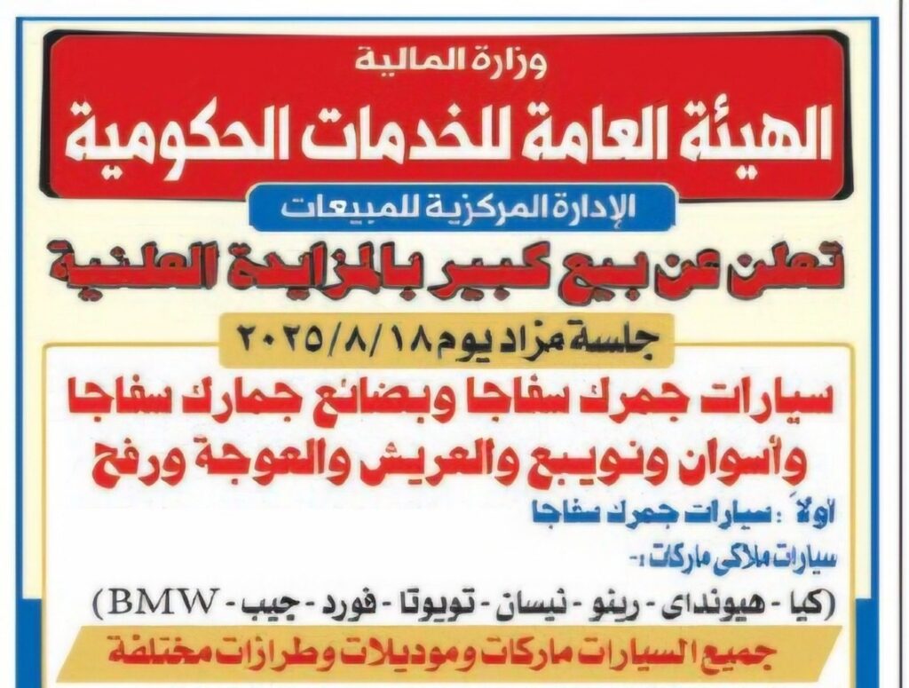 أعلنت الهيئة العامة للخدمات الحكومية التابعة لوزارة المالية عن تنظيم جلسة مزاد علني كبيرة لبيع مجموعة متنوعة من السيارات الواردة من جمرك سفاجا، إلى جانب مخزون من السيارات المخزنة في الصوامع والمستودعات.