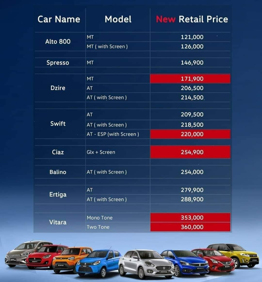 وشملت القائمة أسعار “سوزوكي ألتو- إسبريسو- ديزاير- سويفت- بالينو- سوزوكي أرتيجا.