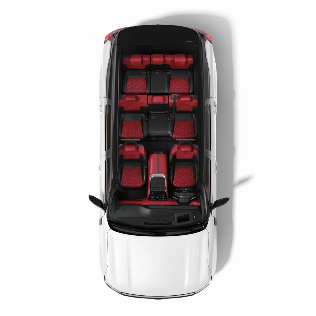 • سعة داخلية كبيرة: تتسع المقصورة لثمانية ركاب بفضل المقاعد الموزعة على ثلاثة صفوف، مع إمكانية ضبط المقاعد حسب التفضيلات الشخصية.