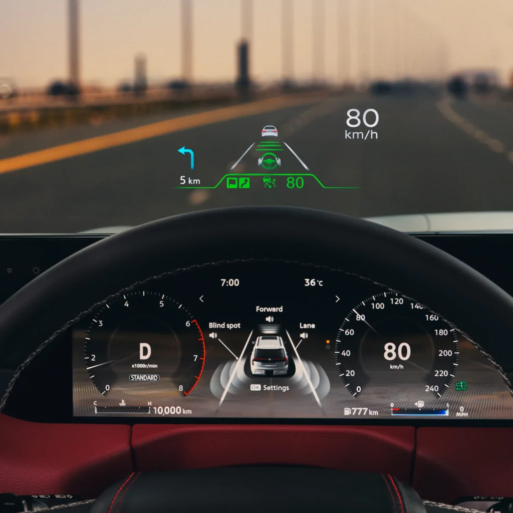 • شاشة عرض أمامية: تعرض بيانات السيارة والمناطق المحيطة بها بشكل واضح ومريح.