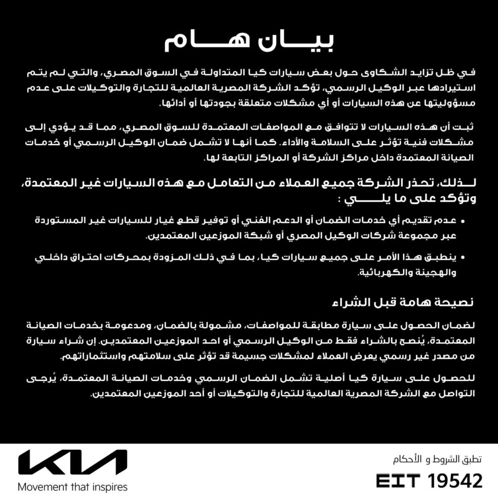 بيان توضيحي من وكيل كيا الرسمي في مصر