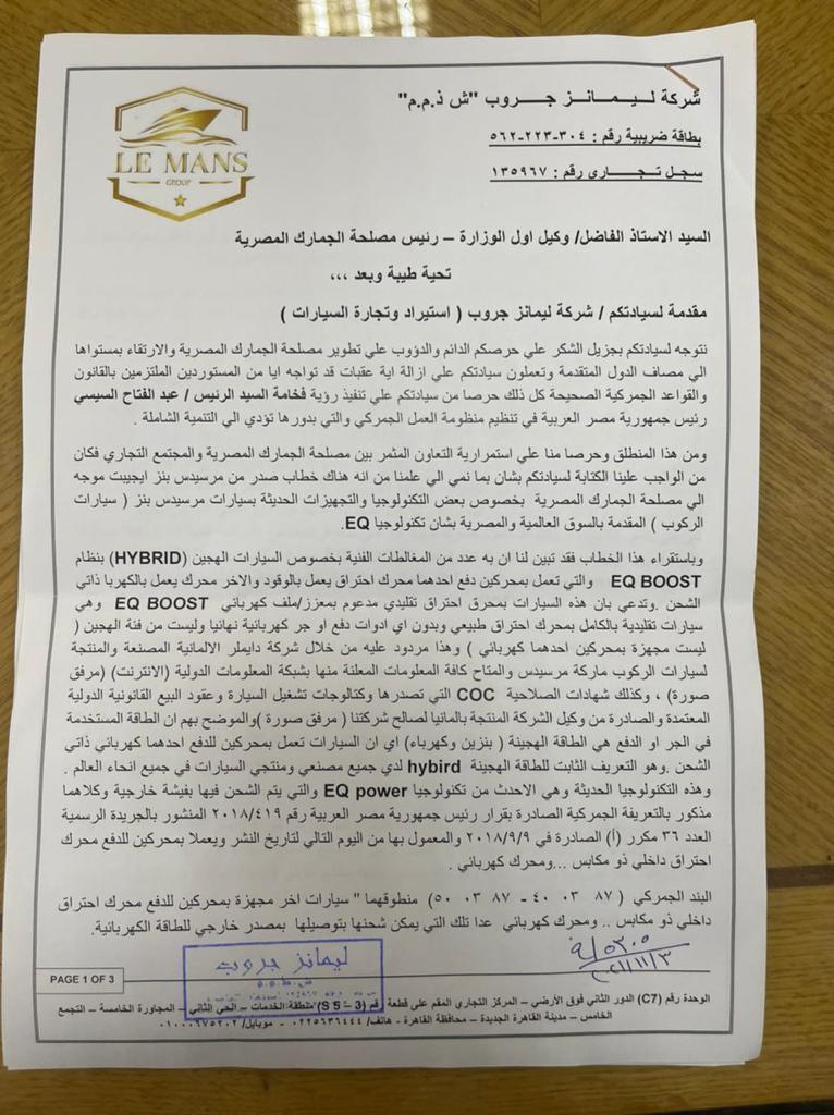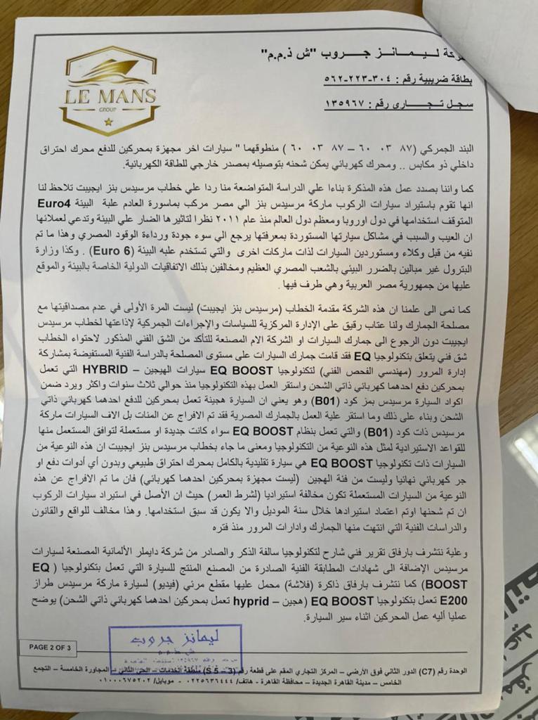 الجمارك إستندت على خطاب مرسيدس بنز إيجيبت و أوقفت دخول شحنة من سيارات مرسيدس EQ موجودة بالميناء على أنها ” هايبرد ” كسر زيرو ( مسموح بإستيرادها ) ، وإعتبرتها سيارة إحتراق كامل وليست كهربائية وليست هجين ، الأمر الي دفع المستورد إلى الطعن في صحة هذا الخطاب وقدم المستندات اللازمة التي تثبت أن السيارات الموجودة بالميناء هي هجين ” هايبرد ” وطلب تشكيل لجنة لفحص السيارات .