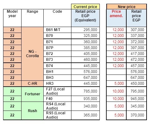 وحسب قائمة أسعار “تويوتا” الجديدة، فقد شملت تويوتا كورولا موديل 2022، وفورتشنر، و راش، و CHR، وتويوتا راش.