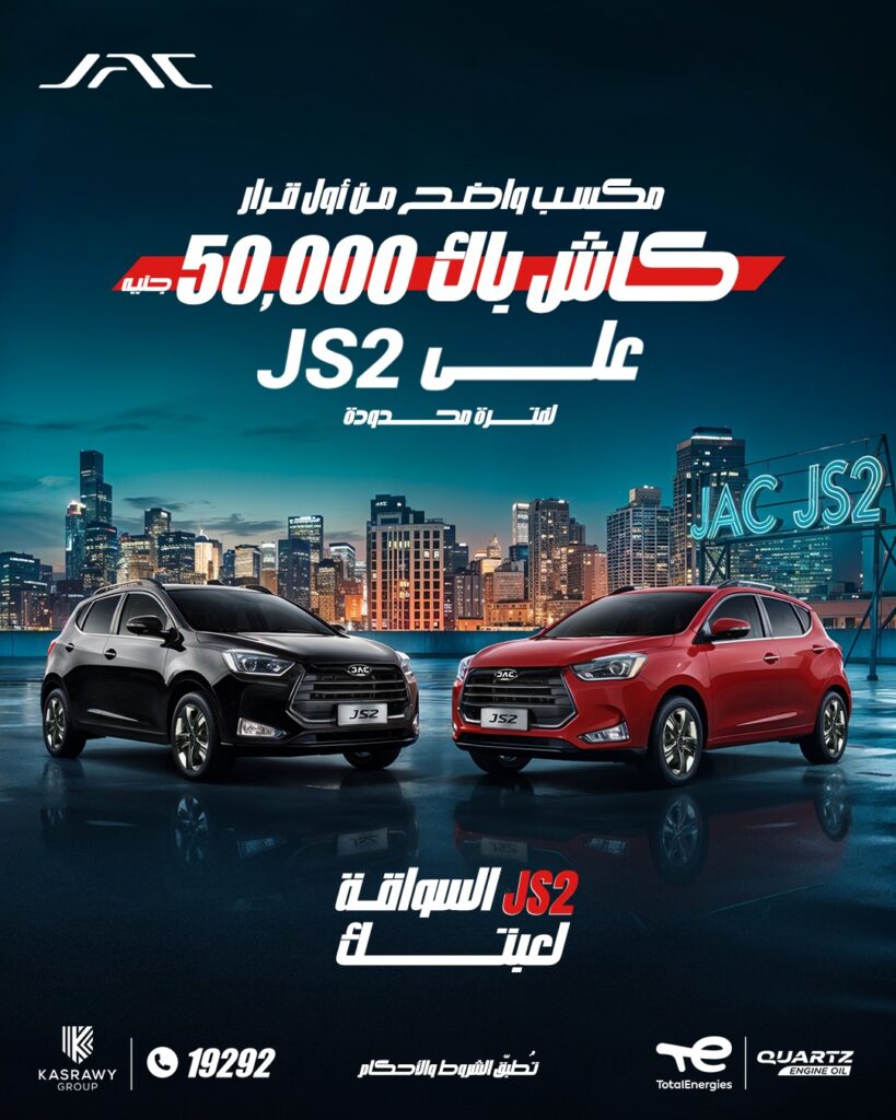 وفي هذا السياق، أعلنت قصراوي جروب، الوكيل الحصري لعلامة JAC في مصر، عن عرض ترويجي مميز على سيارة جاك JS2، يتضمن كاش باك بقيمة 50,000 جنيه مصري، ليجعل منها أرخص SUV في مصر ضمن فئتها.