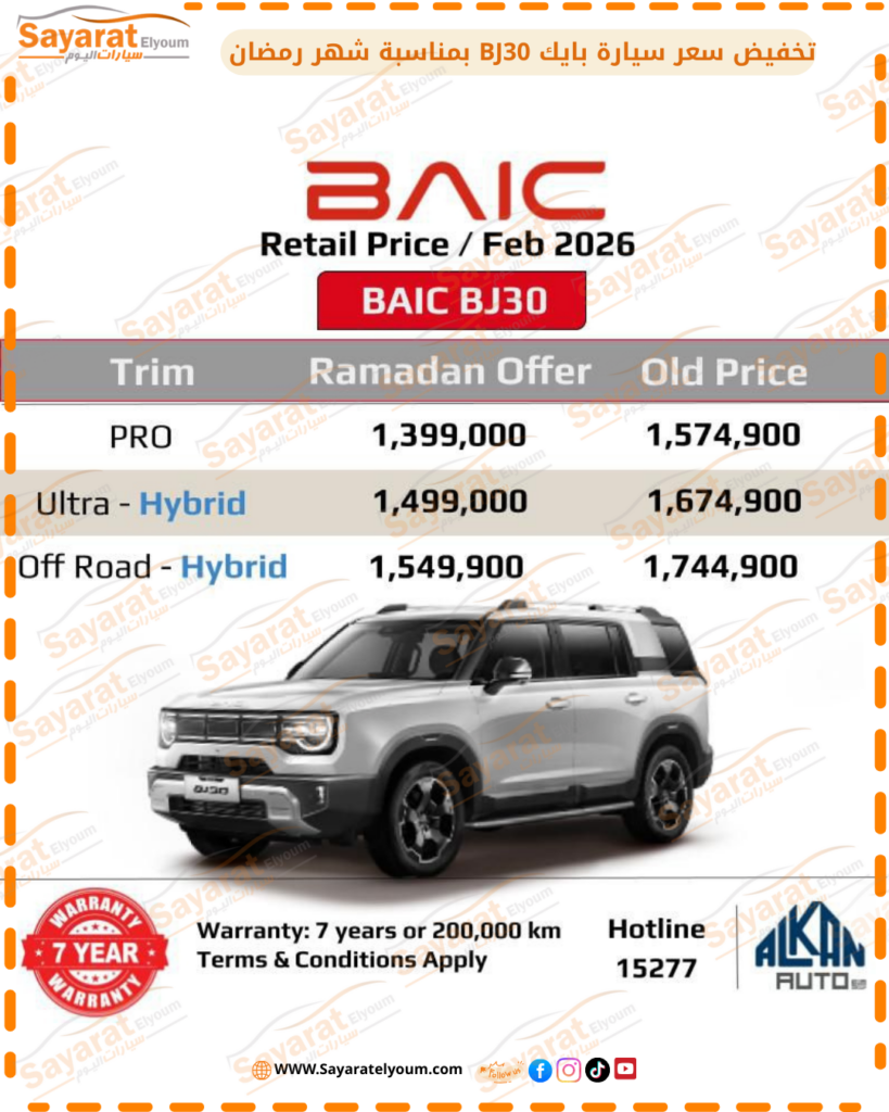 أعلنت شركة ألكان أوتو، وكيل علامة BAIC (بايك) في مصر والتابعة للمجموعة المصرية للسيارات EIM، عن خفض أسعار طراز BAIC BJ30 موديل 2026 بقيمة تصل إلى 195 ألف جنيه على بعض الفئات.
