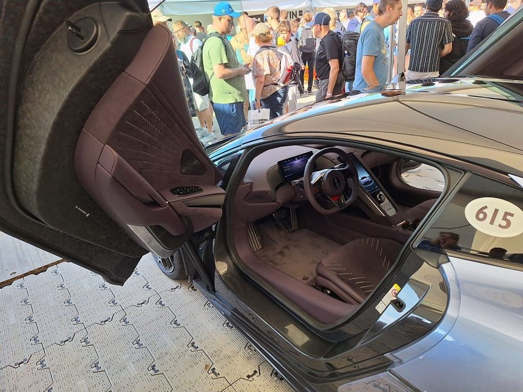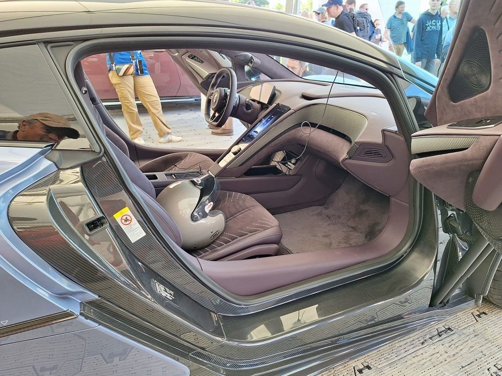 عند النظر إلى الجانب، نجد أن الأبواب مصممة بزاوية علوية وبنوافذ Frameless لإضفاء مظهر رياضي، كما تم تزويد السيارة بعجلات رياضية ثنائية اللون بحجم كبير 275/35 R21 أمامي و 325/30 R21 خلفي، مع كليبرات حمراء لتعزيز المظهر الرياضي.