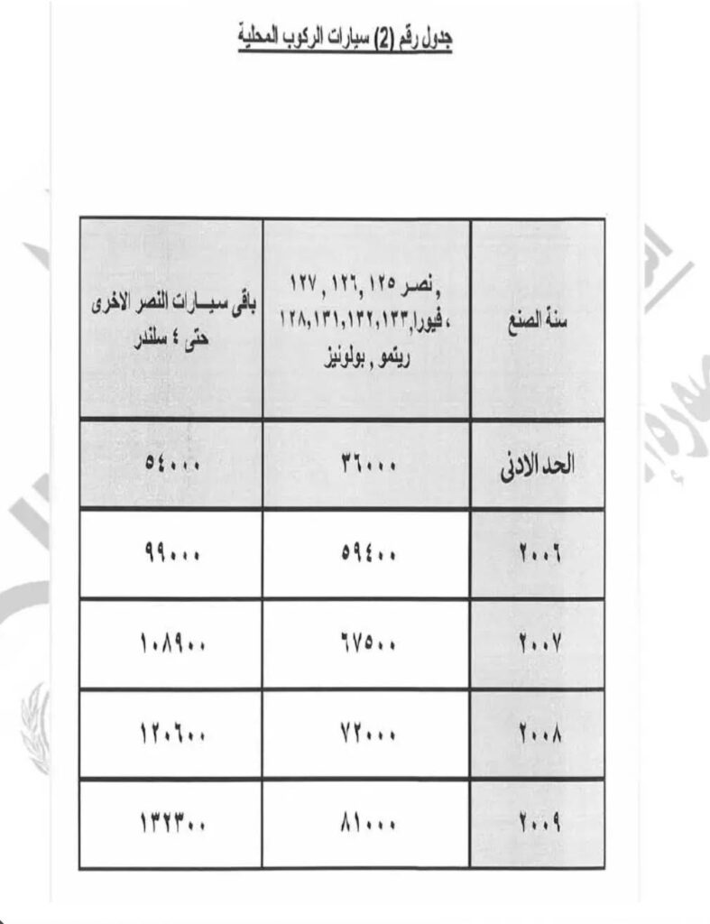 يوضح هذا الجدول الرسوم المقررة لنقل ملكية السيارات المحلية الصنع، مثل نصر، فيات، رينو، بولونيز، وغيرها من السيارات المنتجة محليًا.