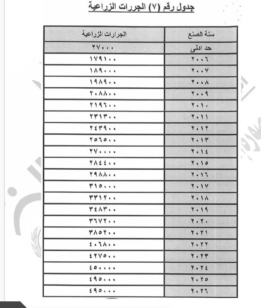 يُبين هذا الجدول رسوم نقل ملكية الجرارات الزراعية، والتي تُستخدم في الأنشطة الزراعية المختلفة. وتُحدد الرسوم استنادًا إلى سنة الصنع فقط، مع زيادة تدريجية في القيمة كلما كانت المركبة أحدث، بما يتماشى مع قيمتها الإنتاجية والاستخدامية.