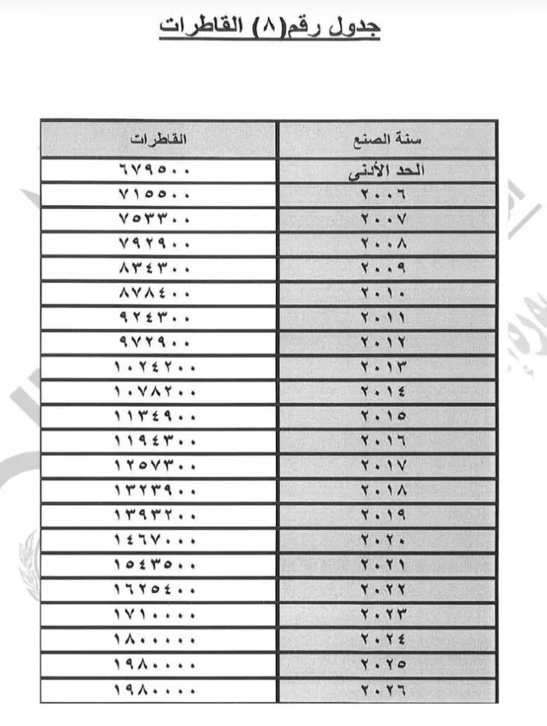 يوضح هذا الجدول الرسوم الخاصة بـ القاطرات، والتي تُستخدم في سحب المقطورات أو الحاويات. تعتمد الرسوم على سنة الصنع، وتُظهر تدرجًا واضحًا في القيمة مع مرور السنوات، ما يعكس تطور التكنولوجيا وقيمة القاطرة السوقية.