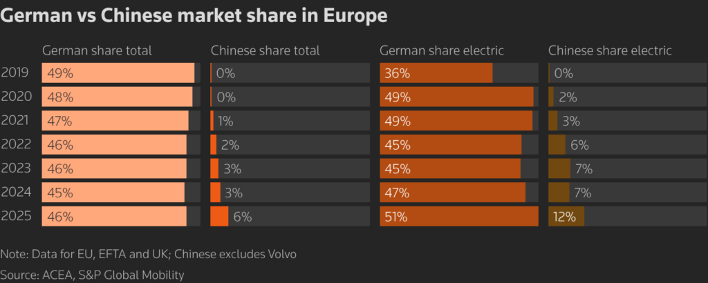 تشير بيانات من S&P Global Mobility إلى أن مبيعات السيارات الألمانية التراكمية في الصين انخفضت بنسبة تقارب 25% لتصل إلى 3.85 مليون سيارة من 5.1 مليون في عام 2019.