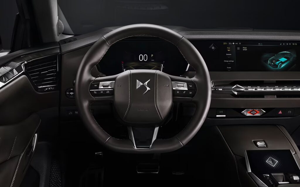 اختارت DS مواد فاخرة بعناية، مثل الكاربون المُشكّل، وخشب الرماد البني، وجلود Nappa أو الجلود المحبّبة مع تطريزات لؤلؤية ونقوش “Clous de Paris” الراقية، لتصنع مقصورة تُشبه صالونًا فرنسيًا دافئًا أكثر من كونها مجرد سيارة.