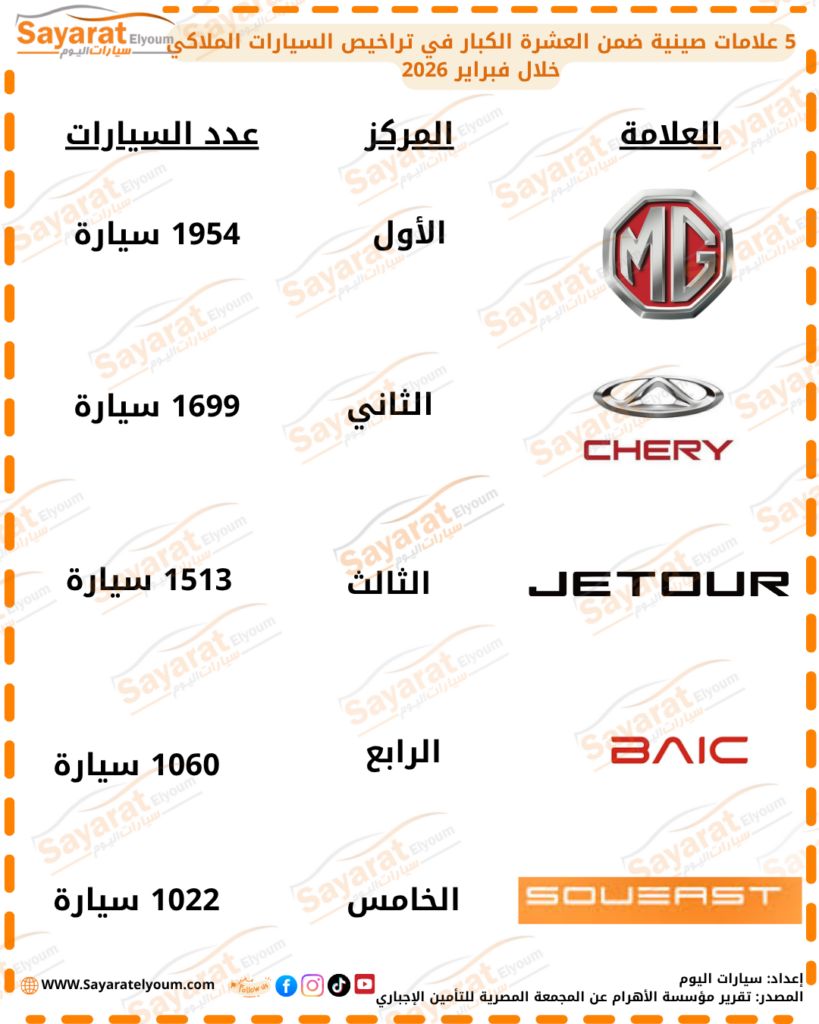 وتواصلت القائمة بحضور قوي لعلامات أخرى، حيث سجلت بايك 1,060 سيارة في المركز السادس، تلتها كيا بـ 1,032 سيارة، ثم سوايست بـ 1,022 سيارة.