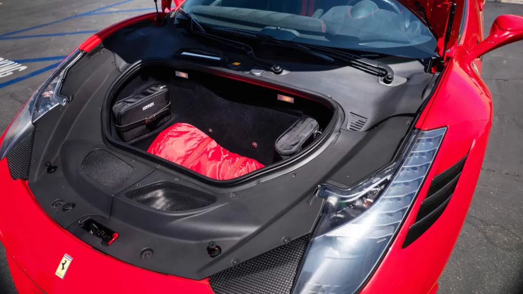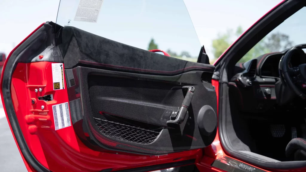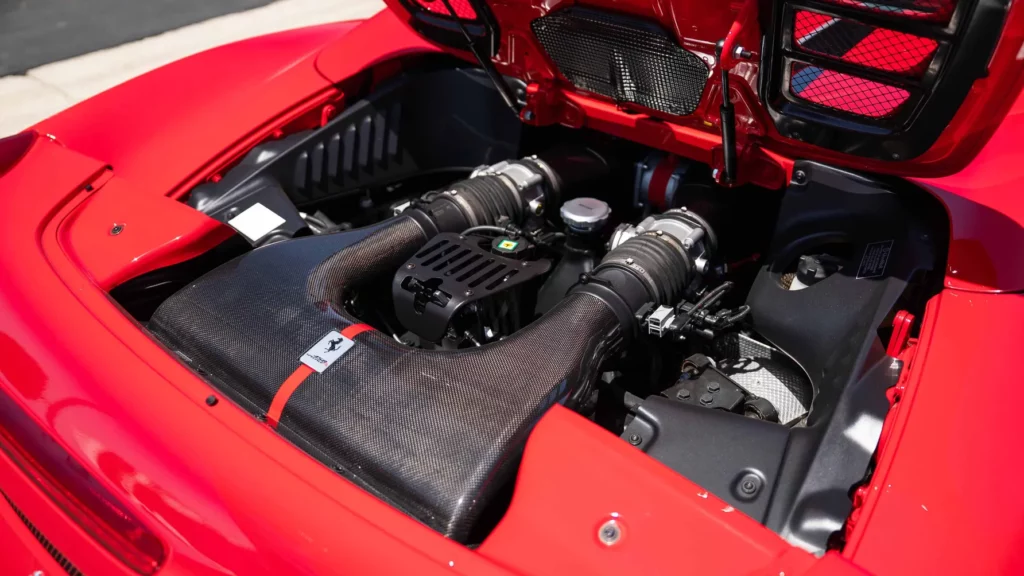 تم تقديم هذه النسخة المعروضة في المزاد باللون الأحمر الأسطوري “روسو كورسا”، الذي يعد علامة مسجلة لفيراري منذ عقود، وتكتمل الهيبة من خلال لمسات سوداء وطلاء لامع يعكس الحرفية الإيطالية الرفيعة.