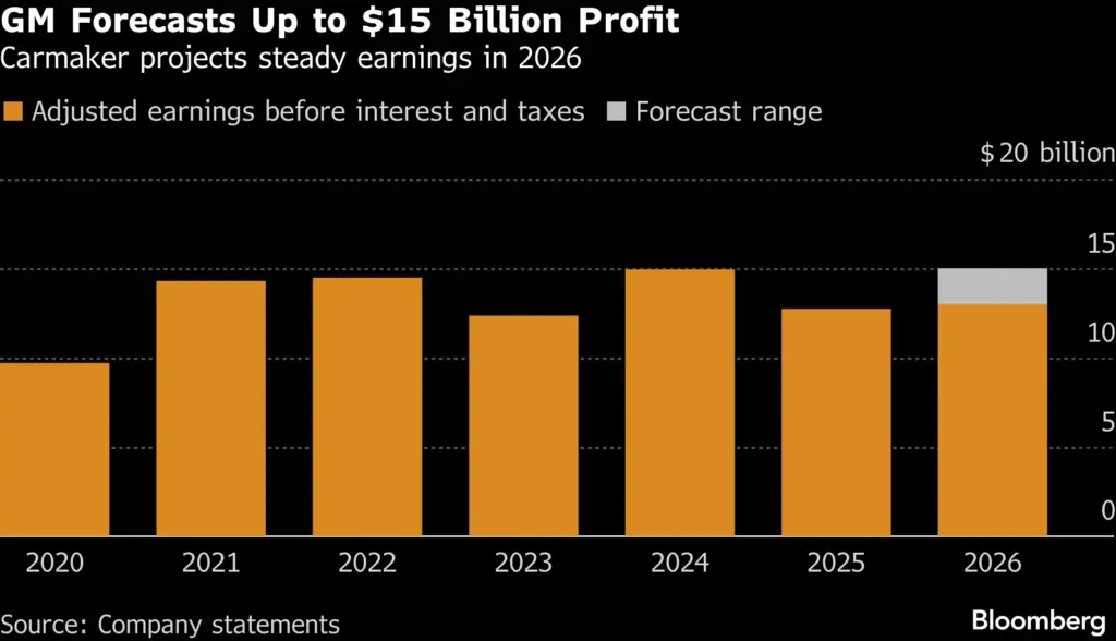 تتوقع جنرال موتورز تحقيق نتائج مالية قوية في العام 2026، حيث من المتوقع أن يتراوح صافي الدخل بين 10.3 مليار دولار و11.7 مليار دولار، أي ما يقارب ضعف قيمته في 2025. كما يتوقع أن تتراوح الأرباح المعدلة قبل الفوائد والضرائب بين 13 مليار دولار و15 مليار دولار.