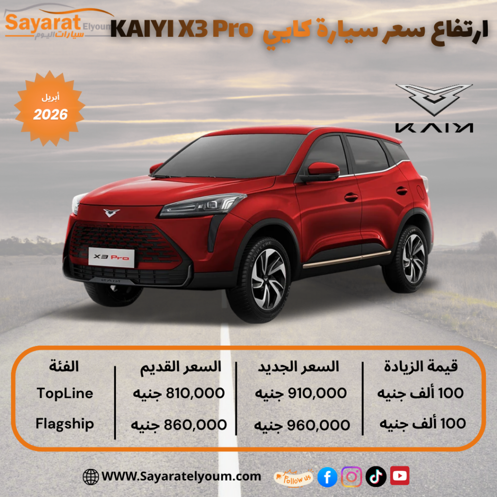 بعد آخر تحديث للأسعار، أصبحت كايي X3 Pro تُباع في مصر بسعر 910 ألف جنيه لفئة Top Line و960 ألف جنيه لفئة Flagship.