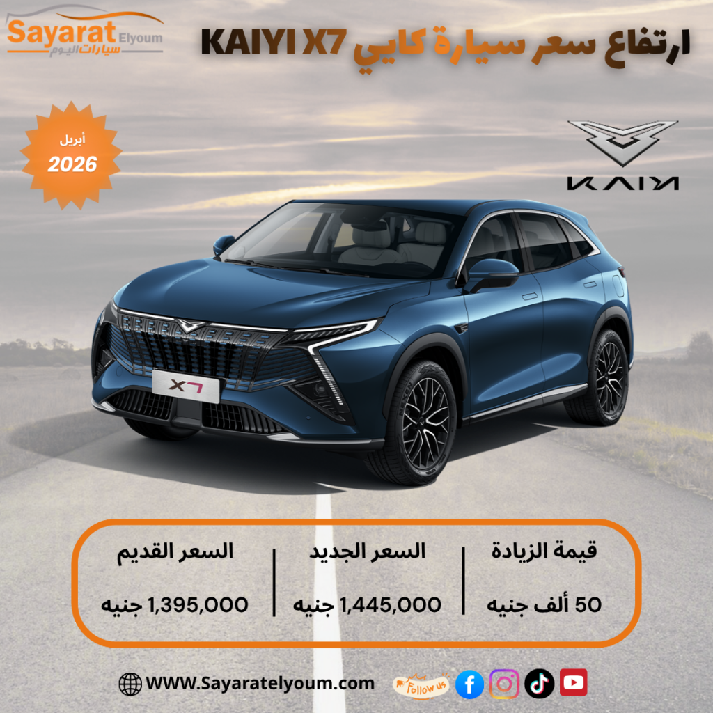 مع طرح Kaiyi X7 موديل 2026 في مصر، دخلت السيارة رسميًا دائرة الزيادات السعرية، مسجلة زيادة 50 ألف جنيه لتصبح 1,445,000 جنيه بدلًا من 1,395,000 جنيه.