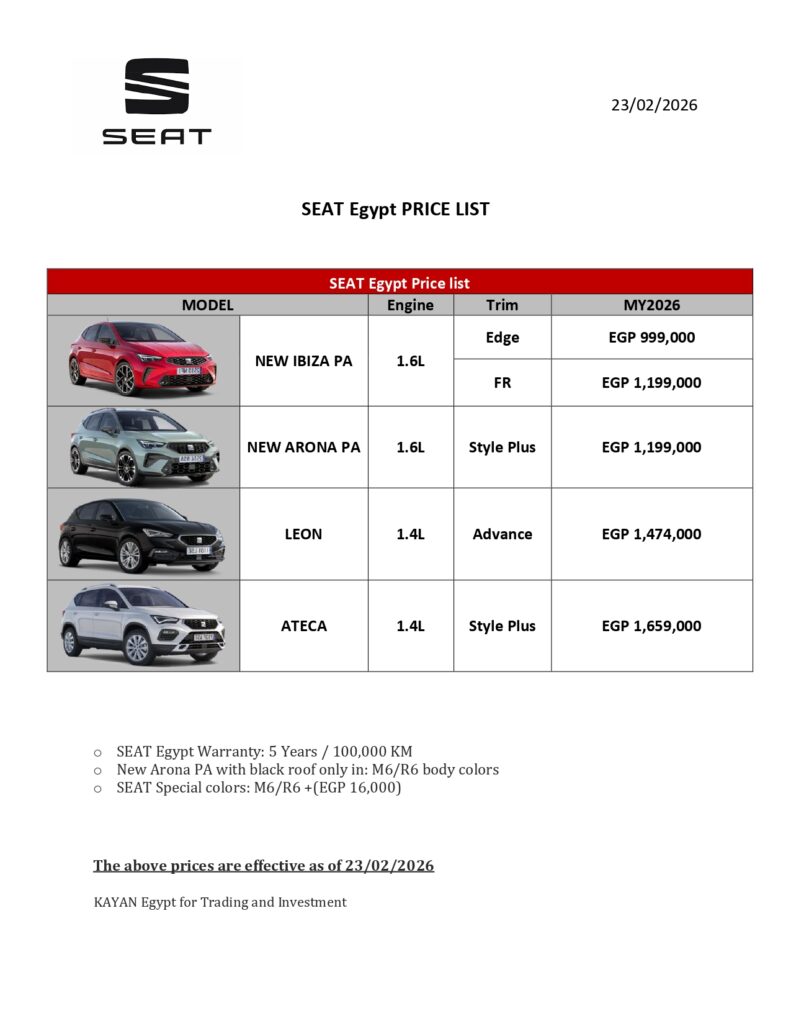 في خطوة تعكس توجهًا واضحًا لتوسيع حضور علامة «سيات» في السوق المصرية إلى جانب شقيقتها «كوبرا»، أعلنت شركة «كيان إيجيبت»—الوكيل الحصري للعلامتين—عن الإطلاق الرسمي للجيل المُحدَّث من طرازي «سيات إبيزا» و«سيات أرونا» موديل 2026.