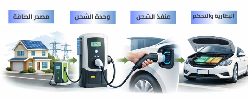 في الشحن السريع DC، جهاز الشحن نفسه هو من يتحكم في الفولت والتيار، ويغذي البطارية مباشرة بقدرات عالية جدًا.